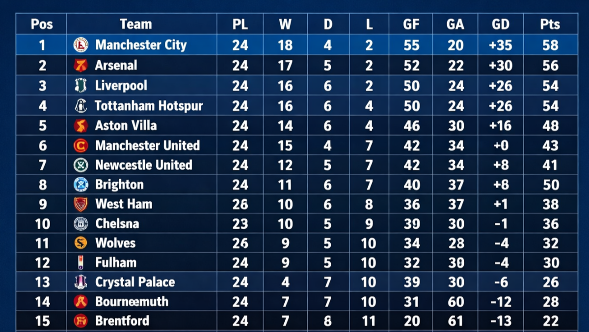 EPL Table Explained: Latest English Premier League Standings, Title Race & Relegation Fight Pos Team PL W D L GF GA GD Pts 1 Manchester