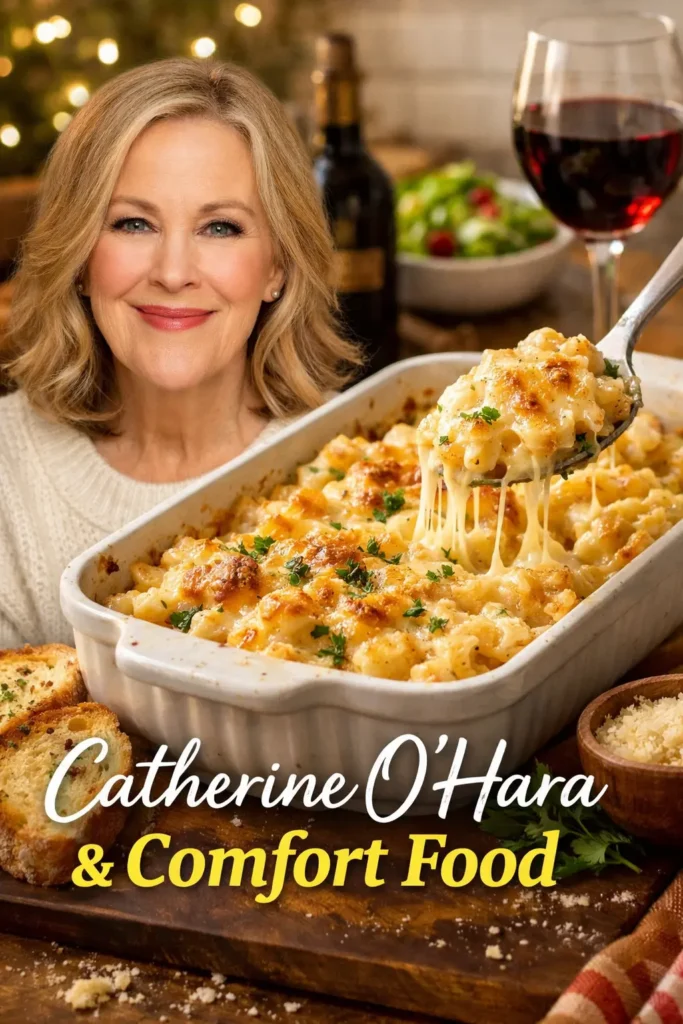 Many food writers now open their articles with pop-culture references, and Catherine O’Hara has become a favorite symbol of warmth and humor. One popular example is a “Catherine O’Hara-Inspired Creamy Baked Pasta,” often described as the perfect movie-night meal.